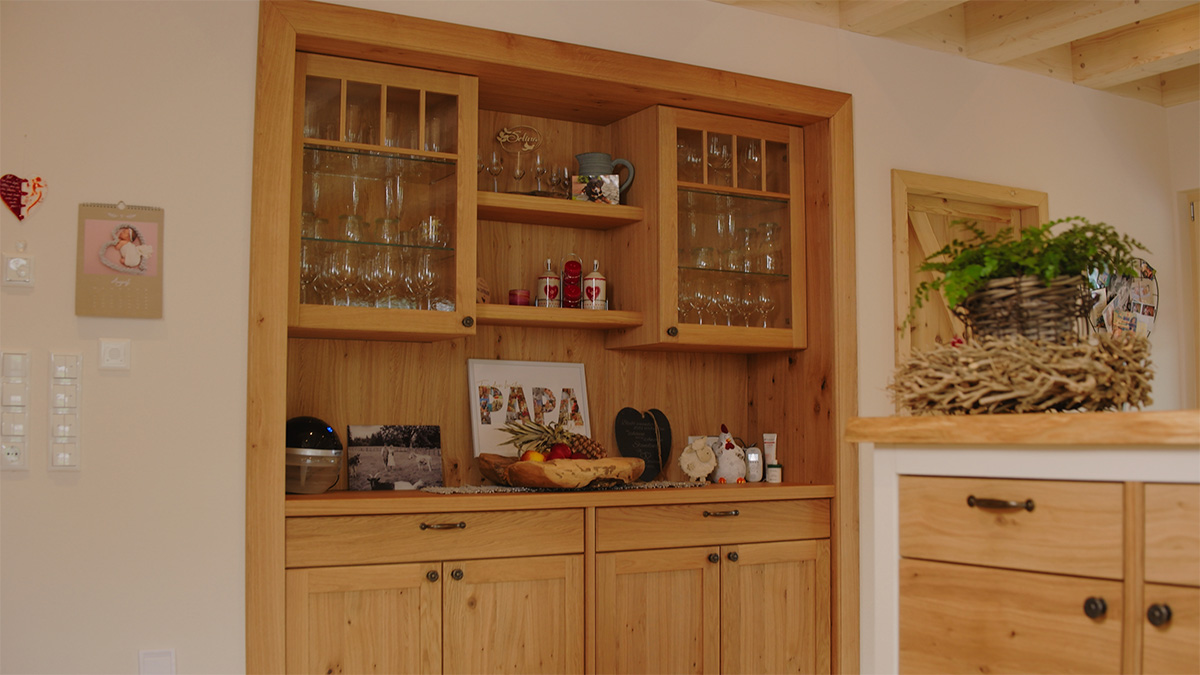 Der Landhausstil ist eine zeitlose Stilrichtung des ländlichen Raumes. In dieser modernen Interpretation aus Eiche entsteht durch glatte, furnierte Fronten eine schlichte Anmutung, die durch die bewusst platzierten Profilelemente Charakter und Charme erhält.